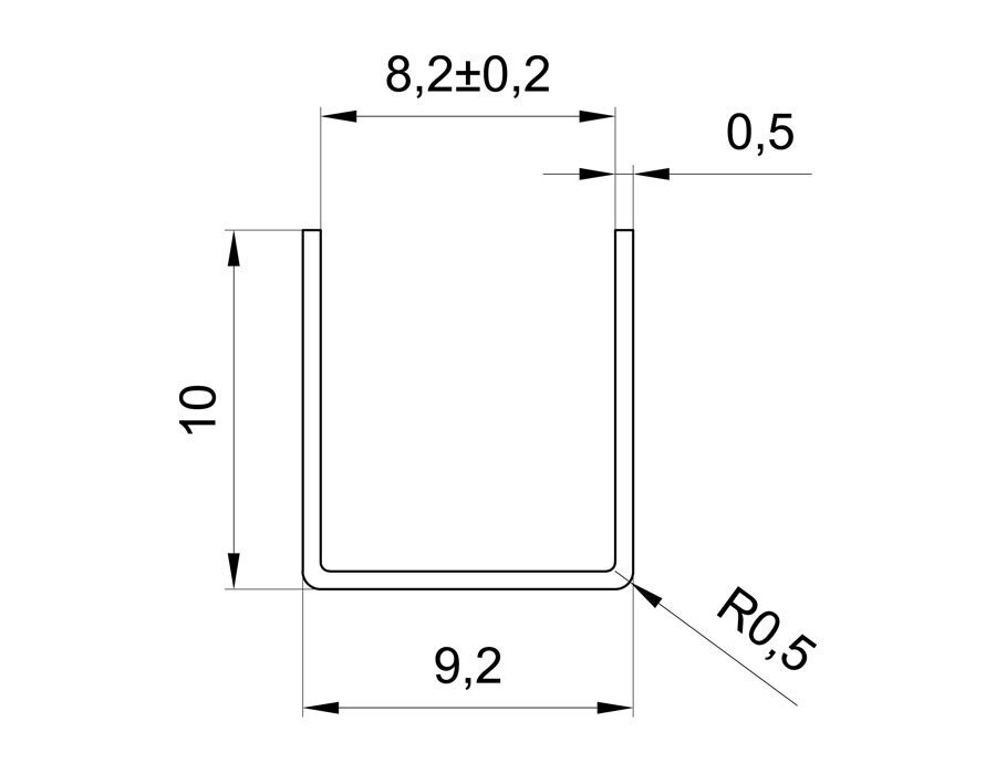 L=2500mm Профиль П-образный для стекла 8 мм (9,2х10/внутр.8,2), толщина 0,5мм