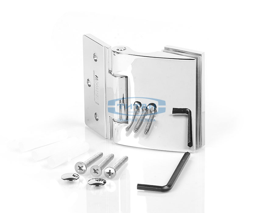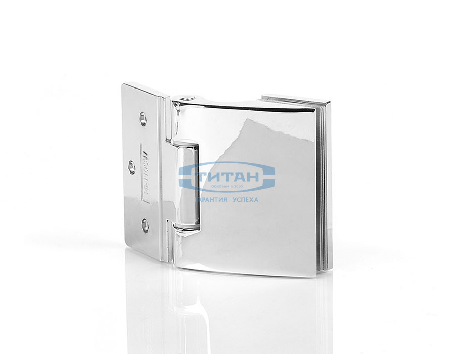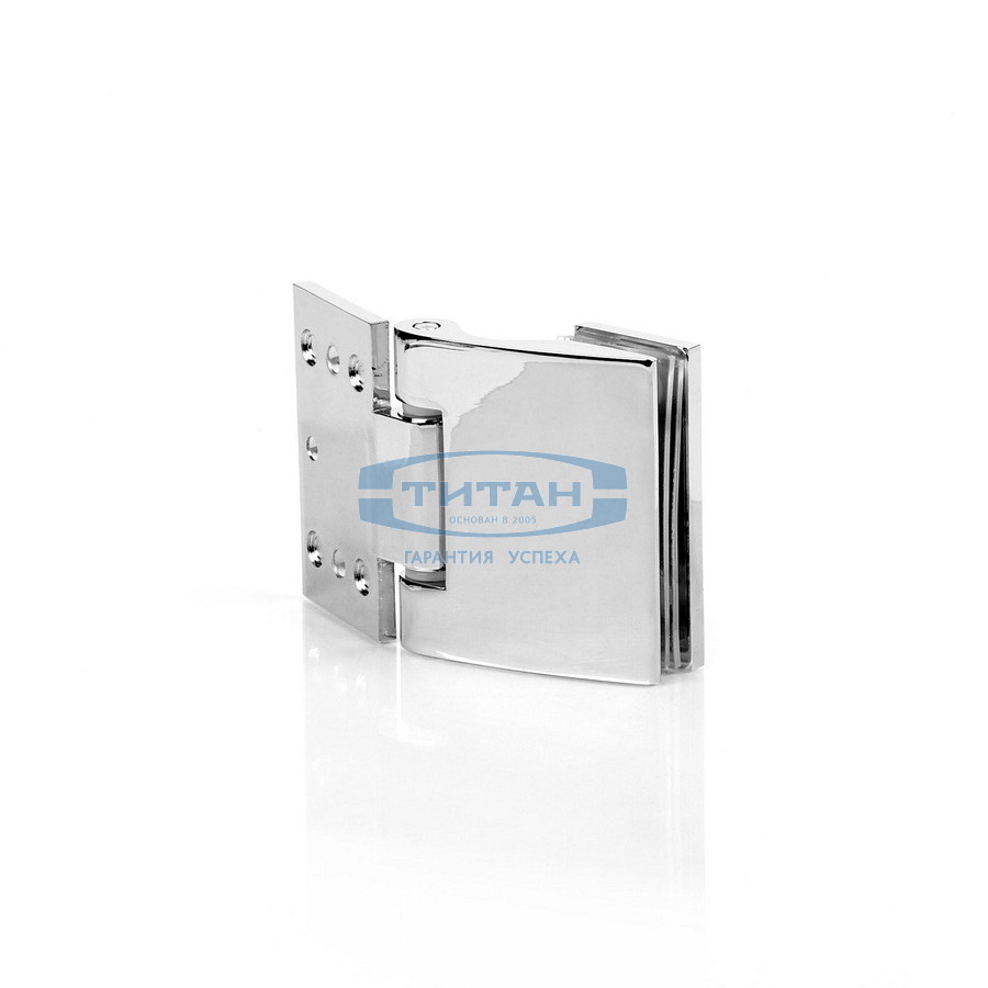 Петля стена-стекло изготовлена из цинкового сплава высокой прочности. Элемент обеспечивает открывание на 90° наружу. Модель подходит для стекол толщиной 8-10 мм. Рекомендуемая ширина полотна — 600 мм при весе двери до 30 кг на обе петли.