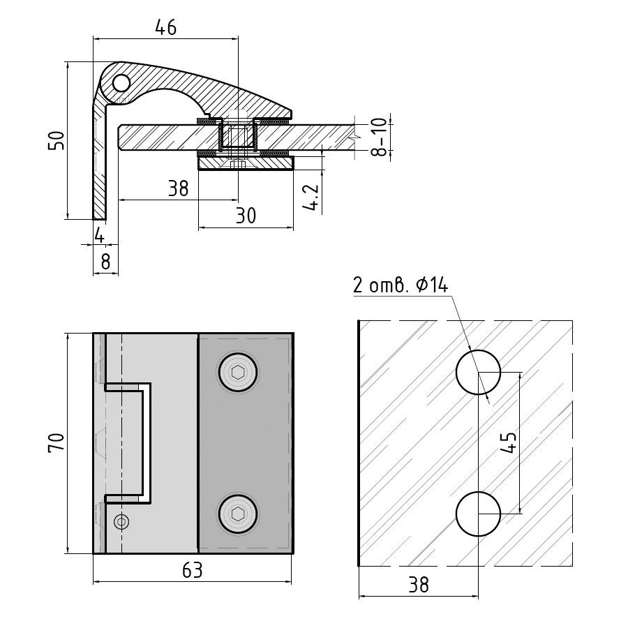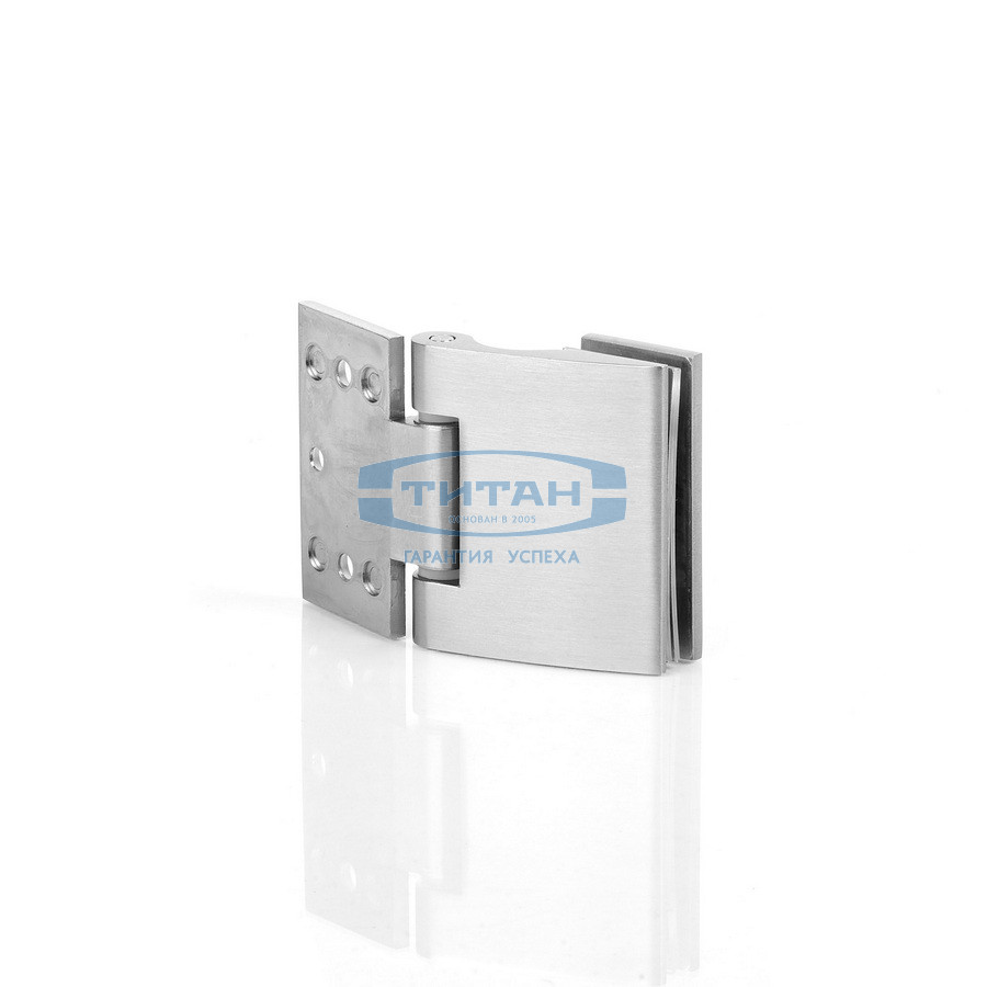 Петля стена-стекло изготовлена из цинкового сплава высокой прочности. Элемент обеспечивает открывание на 90° наружу. Модель подходит для стекол толщиной 8-10 мм. Рекомендуемая ширина полотна — 600 мм при весе двери до 30 кг на обе петли.