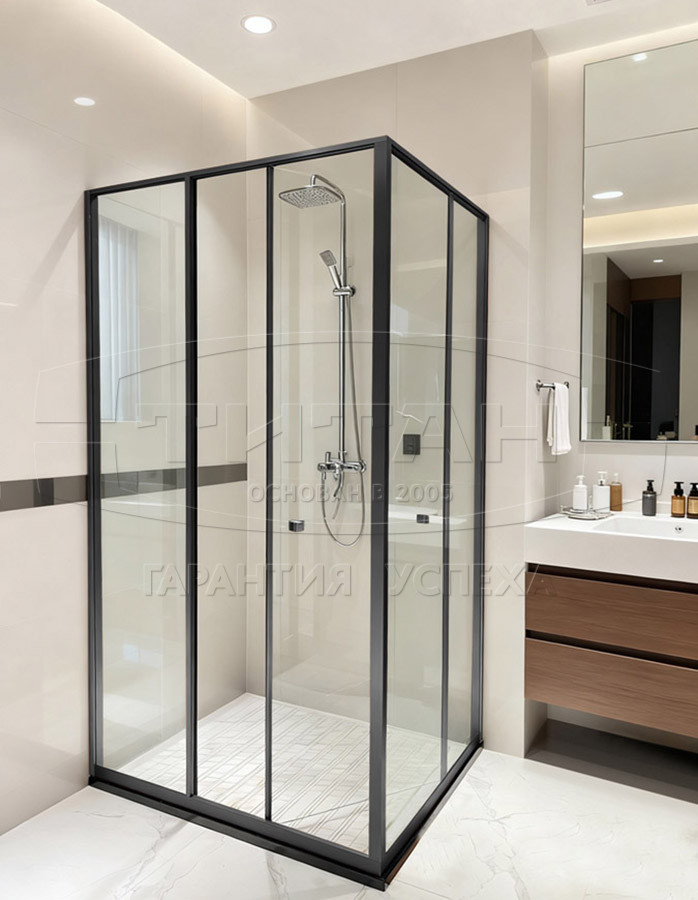 Комплект раздвижной системы "Инфинити" предназначен для сборки углового душевого граждения с одной поворотоно-откатной дверью.