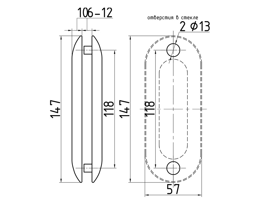 Данный комплект может монтироваться на стекло толщиной от 6 до 12 мм. Крепление фурнитуры осуществляется в технологический вырез с помощью шпильки, входящей в набор. Диаметр технологического отверстия в стекле составляет 13 мм.
