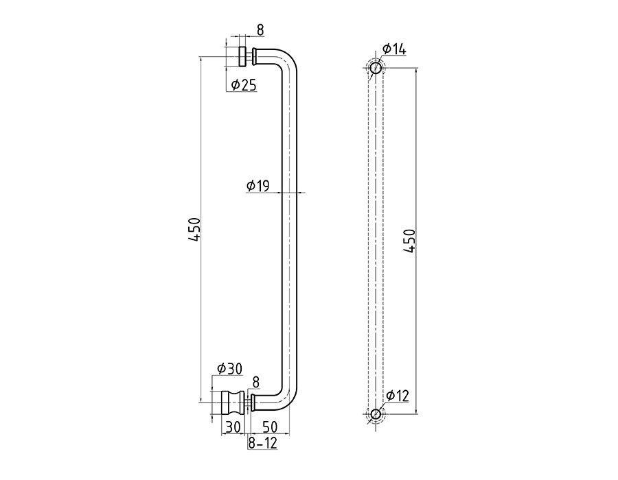 Отверстия в стекле – Со стороны ручки кноба - ⌀12 мм. Со стороны заглушки - ⌀14 мм.