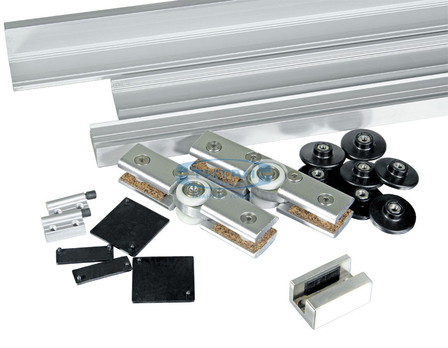 Комплект раздвижной системы "Дельта". В комплект входит: 1) Трек (длина 2.5м. отделка - анодировка) 2) Две каретки (максимальная нагрузка на две каретки - 80 кг, подходят для 10 мм. стекла) 3) Два стопора 4) Направляющая (для 10 мм. стекла) 5) Комплект пластин для крепления раздвижной системы на стекло - 8 шт. 6) Декоративная крышка (длина 2.5м. отделка - анодировка. Одевается на пластины для крепления раздвижной системы, в случае крепления на стекло) 7) Две торцевые заглушки для трека и две торцевые заглушки для декоративной крышки (материал - черный пластик).