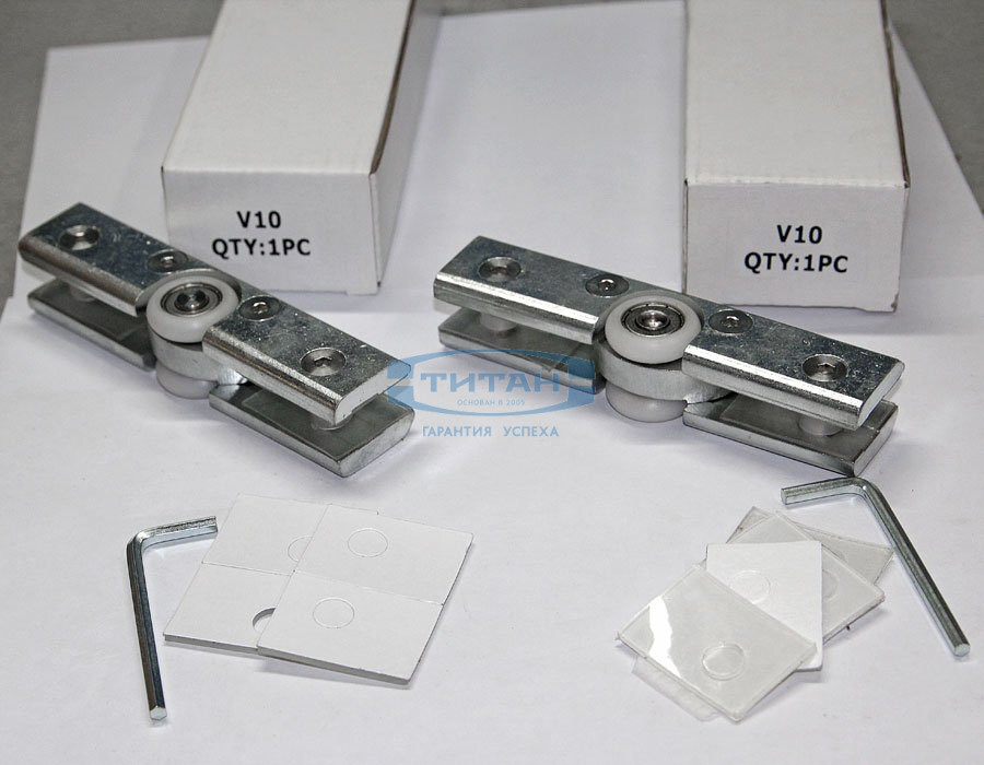 Две каретки. Это роликовые механизмы прямоугольной формы, которые вставляют в пазы направляющего трека и крепят к стеклу. Максимальная нагрузка на две каретки составляет 80 кг.
