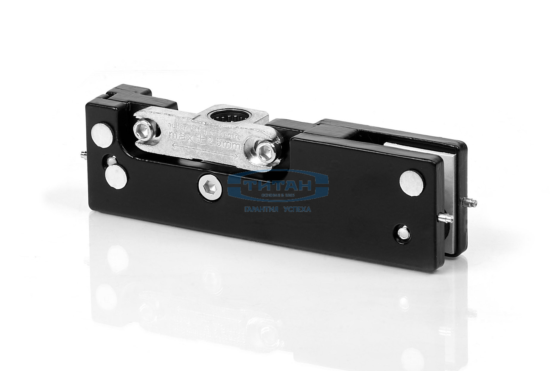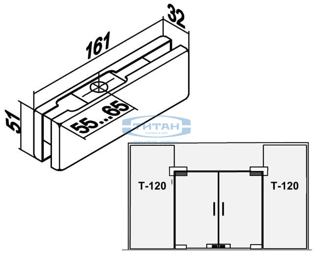 Для крепления стеклянных полотен используется специальная фурнитура — фитинги. Они обеспечивают конструкции максимальную прочность и позволяют открывать дверную створку в обе стороны. Такая фурнитура крепится в стены, пол и потолок и служит петлями, по которым движутся дверные створки. Одним из элементов фурнитуры для маятниковых дверей серии «Классика» является верхний фитинг для стекла «T-120». Он устанавливается на верхней кромке стеклянной двери в качестве ответной части стоящего над ним углового фитинга. Эта конструкция способствует равномерному распределению нагрузки полотна на угловые крепления.
