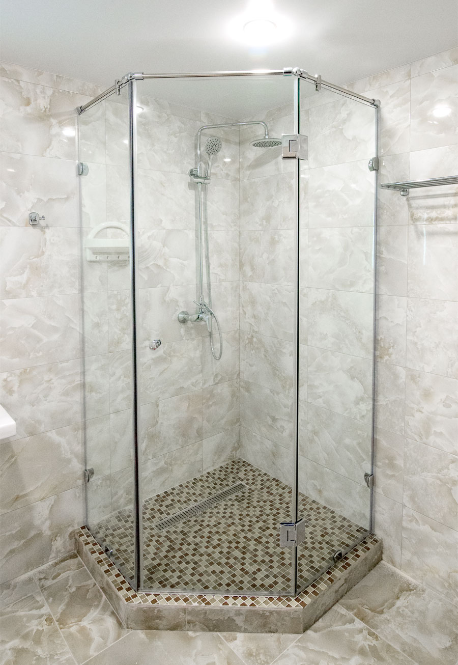 У угловых душевых кабин боковые стенки и дверца, которая может быть маятниковой, распашной или раздвижной, крепятся к облицованным кафелем стенам. Первые два вида дверок актуальны, если есть участок для их распахивания, а вторые, — когда его нет. Панели монтируются прямо на пол, а жидкость уходит в слив. Это самый экономичный и технически несложный вариант, обладающий следующими плюсами: