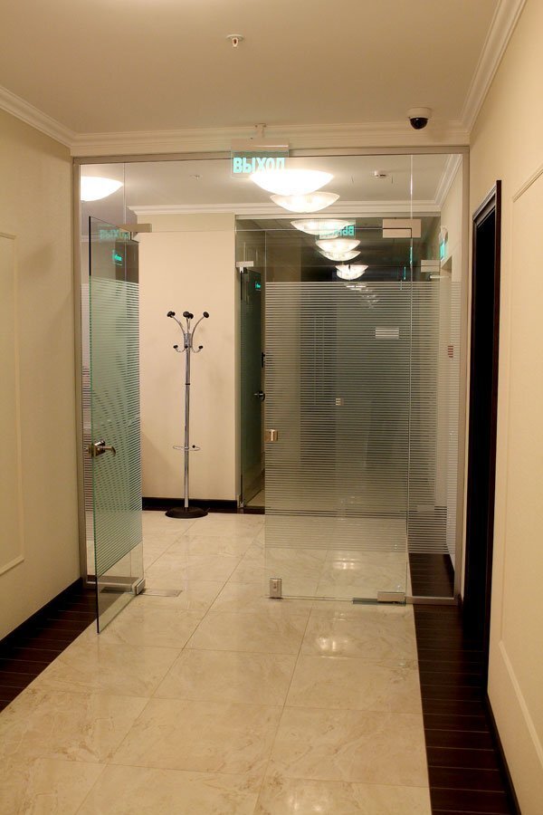 С доводчиком. Такой вариант будет оснащаться петлями вверху и внизу, может включать в себя напольный угловой замок (при желании) и трубчатую ручку необходимой длины. Напольный механизм фиксируется в поверхность пола (утапливается). Маятниковые двери из стекла с доводчиком свободно открываются в обе стороны, а при необходимости – их можно зафиксировать в открытом положении. Такой механизм используют в качестве основания для вращения петли, установленной снизу. Дверная конструкция часто дополняется стеклянными перегородками.