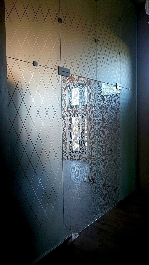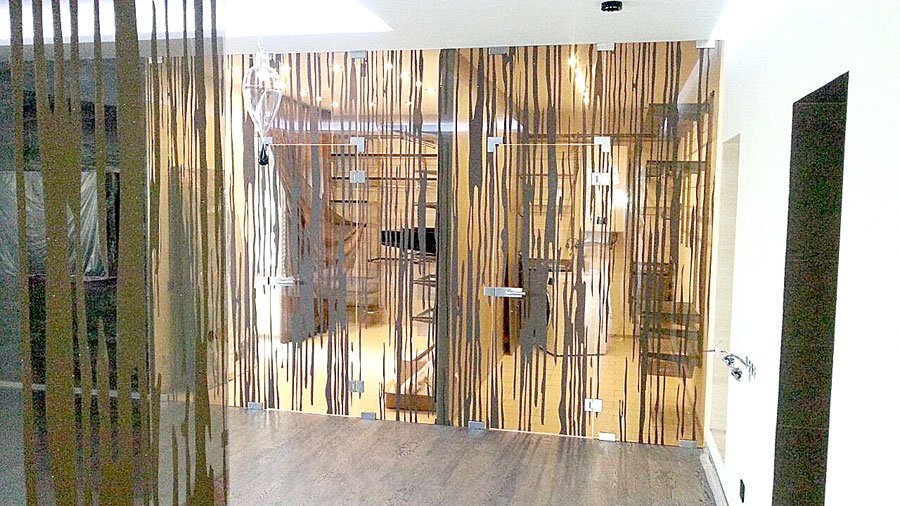Если проход широкий (более 1,2 м), в него рекомендуется устанавливать двустворчатые дверки, причём можно оставить одну створку «маятниковой», а другую сделать «распашной» посредством ограничителя. Сегменты выполняются в любом дизайне, главное, чтобы стекольный лист был закалённым и прошедшим механическую обработку. Несмотря на то, что светопрозрачные сооружения создают ощущение воздушности и невесомости, такой вариант подходит больше для офисов, чем для квартир и домов, поэтому домовладельцы предпочитают изделия с декорированным стеклом.