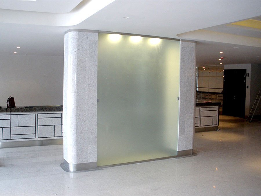 40 миллиметров. Наиболее востребованная разновидность фурнитуры, с помощью которой можно создавать парящие и невесомые цельностеклянные конструкции. С этой целью в стене, напольном или потолочном покрытии создается специальное углубление, в которое монтируется сначала опорный швеллер, а затем — профиль для крепления стекла. Это делает зажимной механизм абсолютно незаметным, а сама дверь или перегородка кажется совершенно прозрачной.